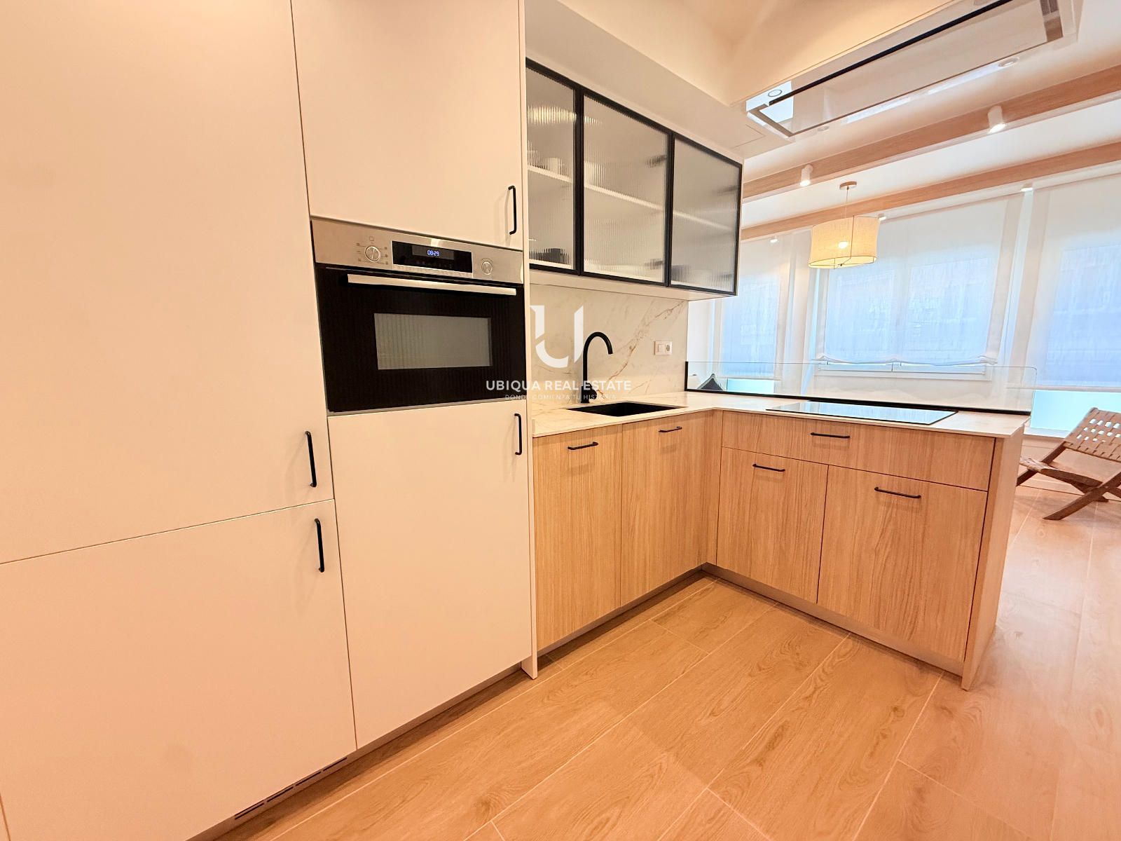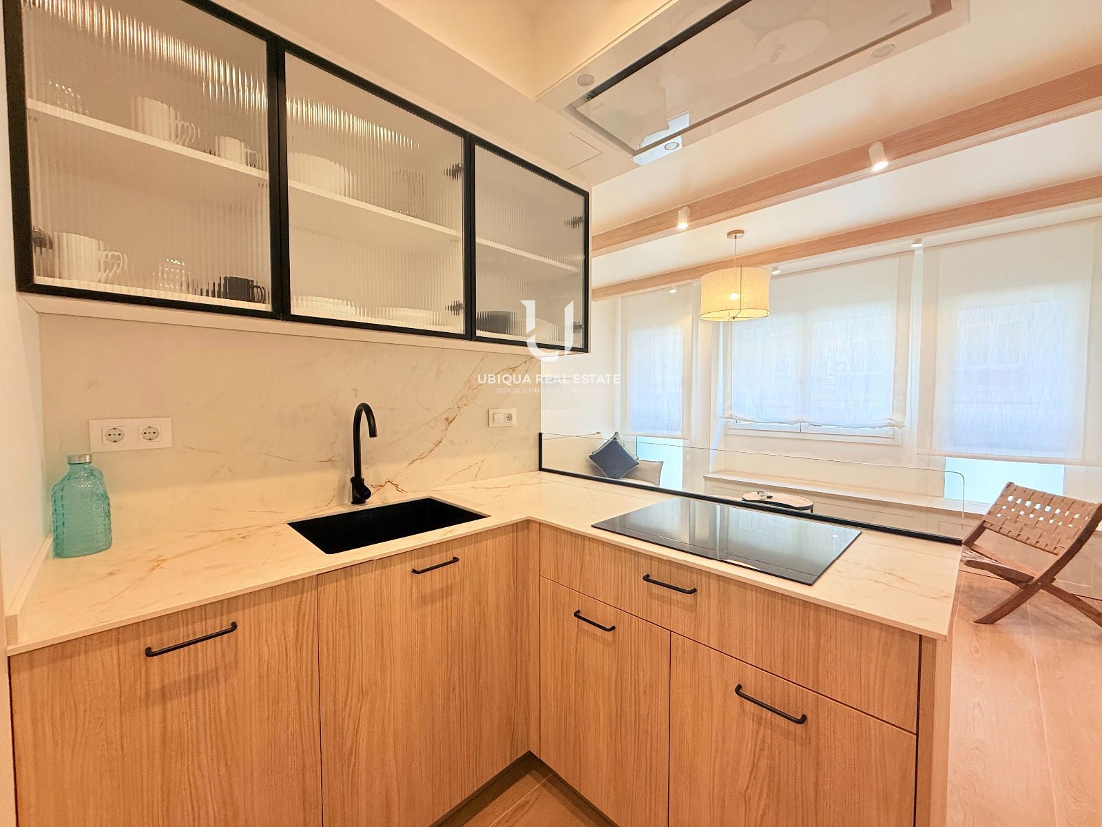 Saló-menjador lluminós amb cuina oberta, totalment equipada amb electrodomèstics d'alta gamma, creant un ambient funcional i acollidor.