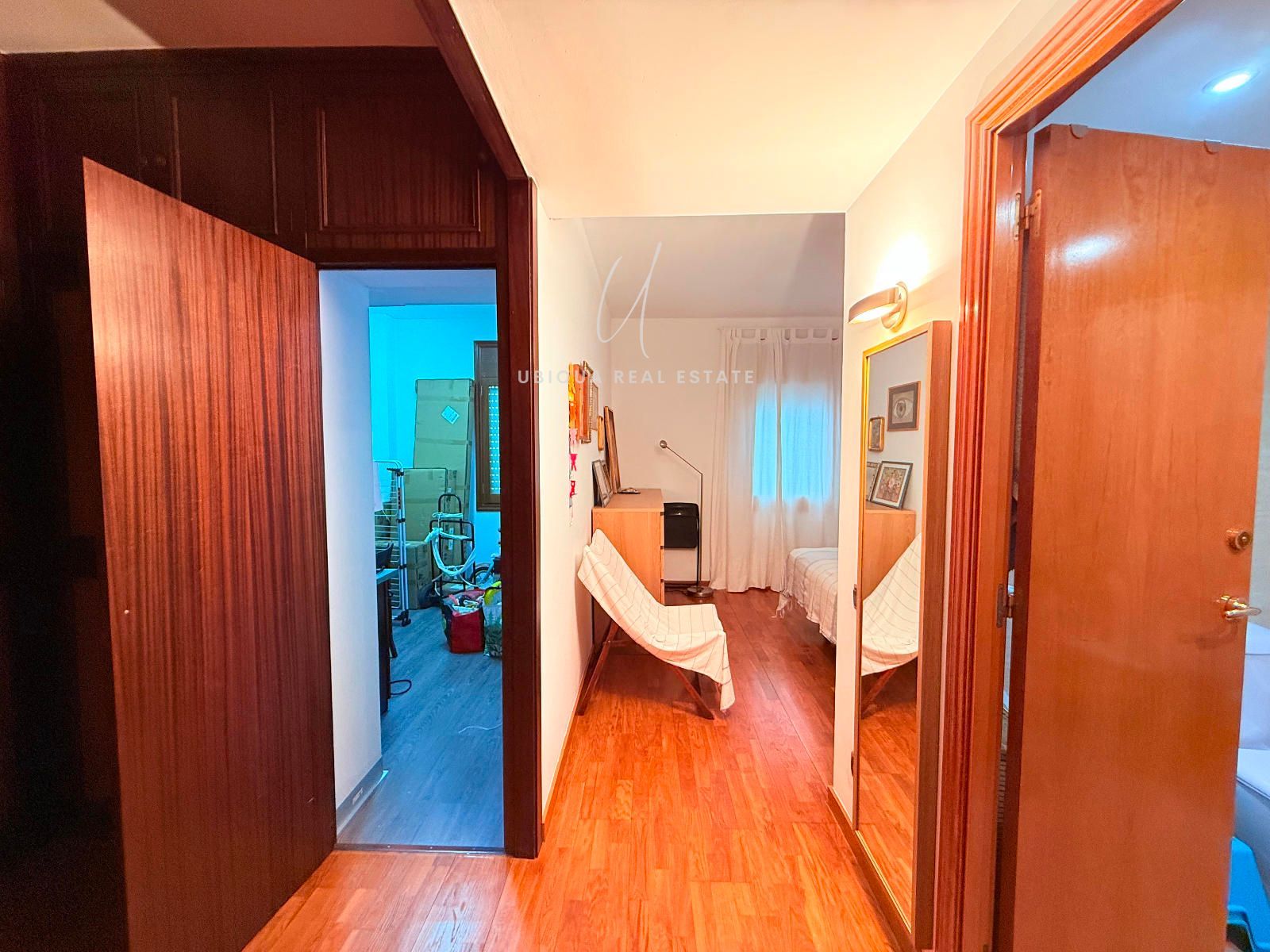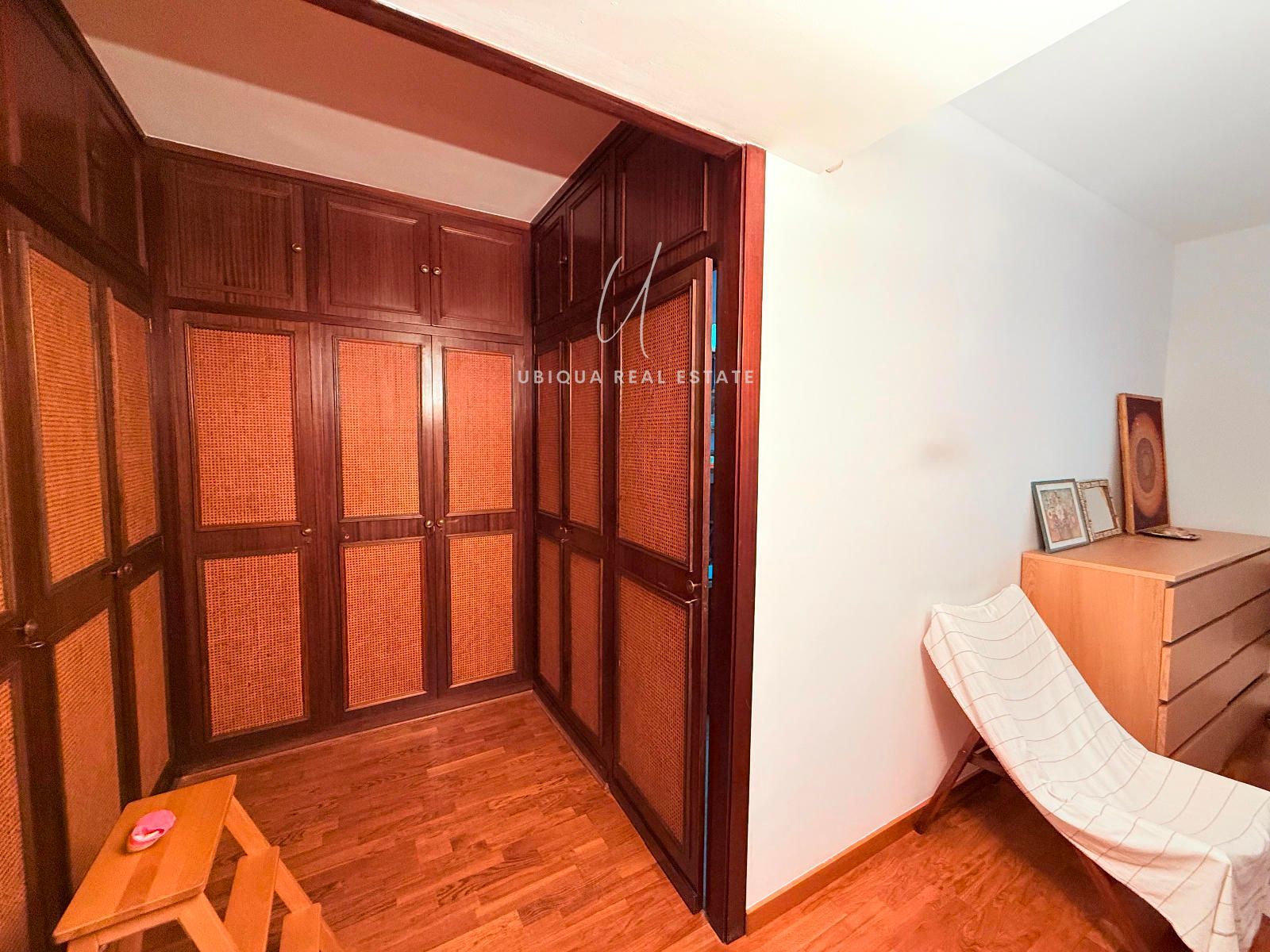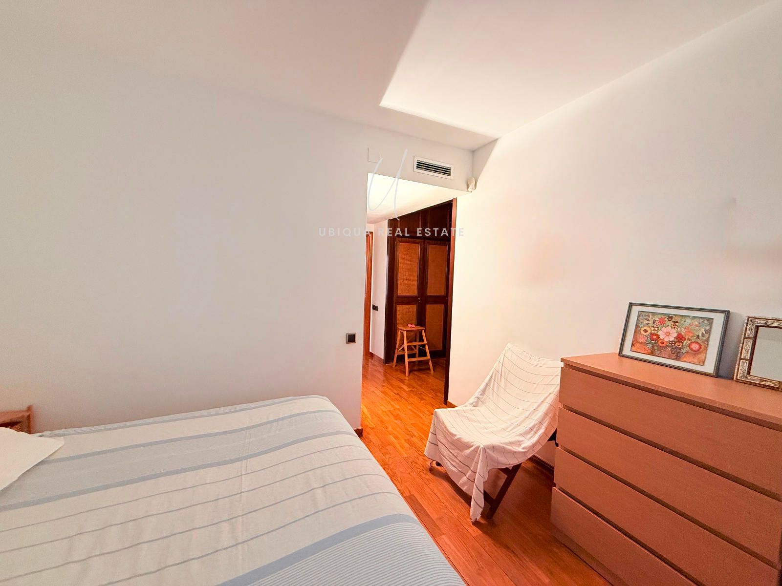 La zona de noche está compuesta por tres habitaciones exteriores: dos dobles y una suite principal con baño privado, vestidor con armarios y un cuarto adicional ideal como despacho o zona de almacenaje. En total, dispone de dos baños completos.
