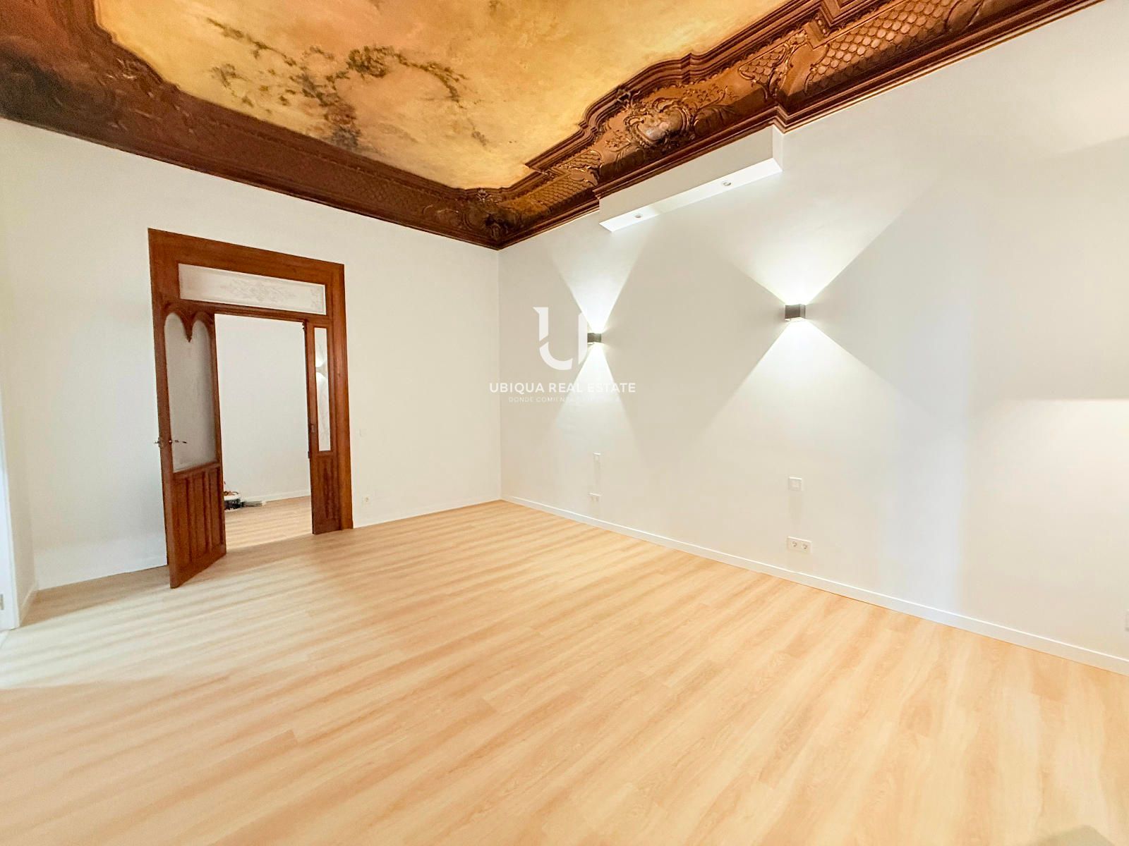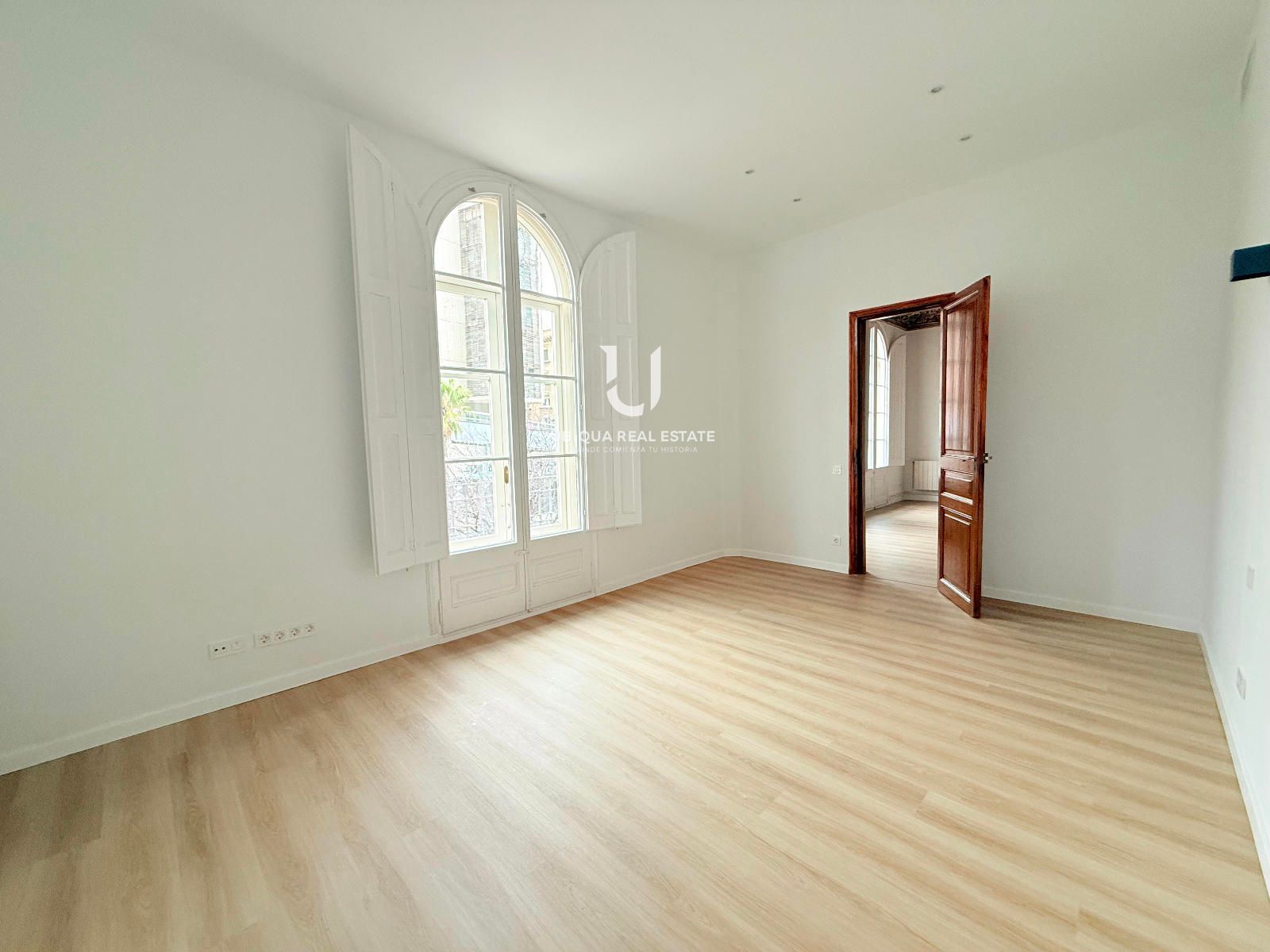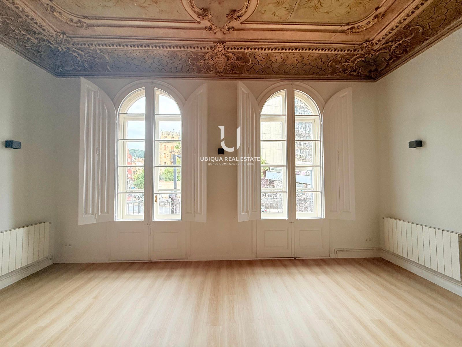 Se distribuye en 6 dormitorios exteriores con amplios ventanales, salón-comedor de generosas dimensiones también exterior, baños completos renovados y cocina office independiente totalmente equipada. Destacan los techos altos perfectamente conservados y los suelos de parquet noble en todas las estancias, que aportan calidez y elegancia clásica.