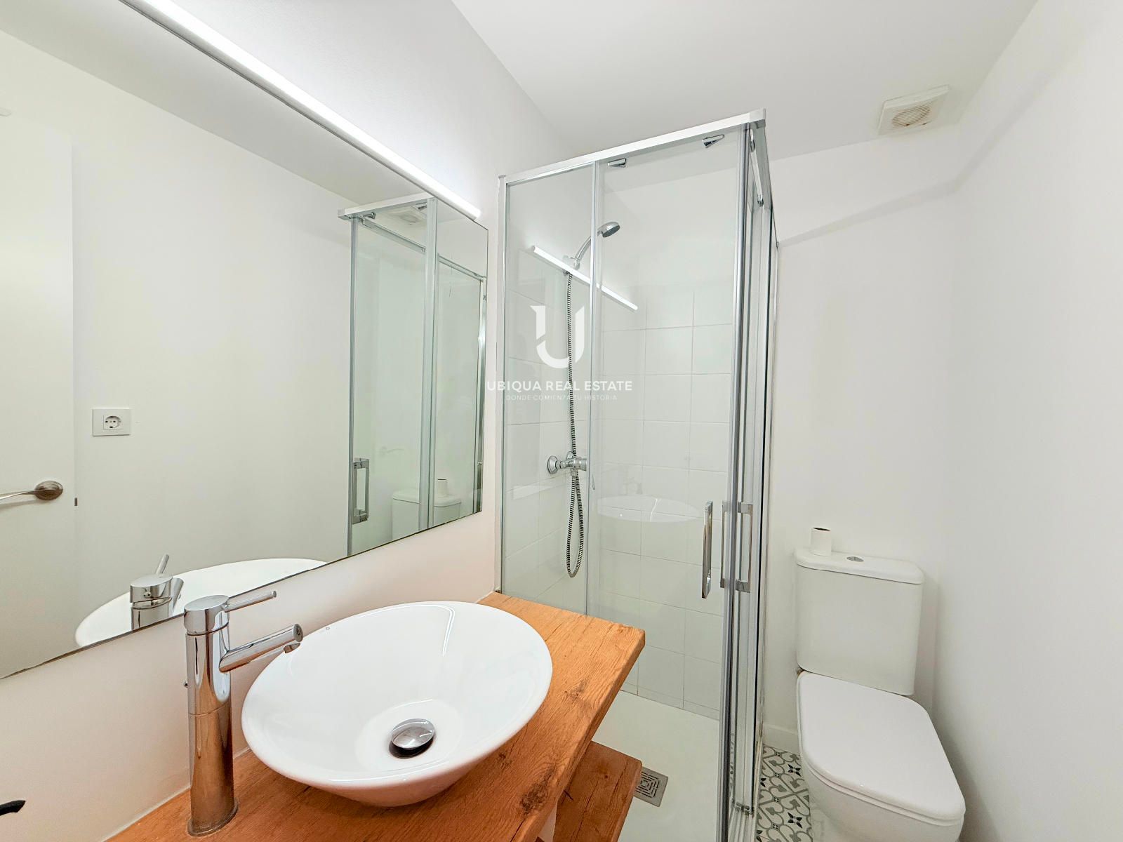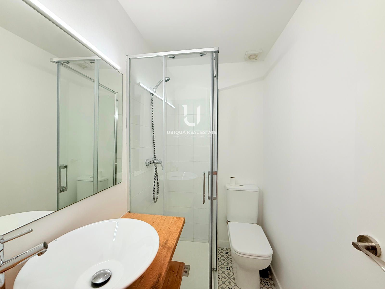 Baño completo de diseño moderno, con ducha y mobiliario renovado. Se incluyen toallas.