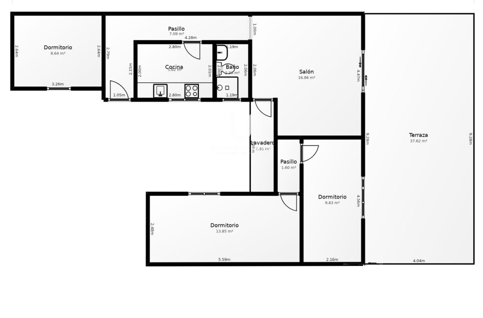 La terraza de 37 m² es el elemento protagonista, ofreciendo espacio suficiente para crear zona chill-out, comedor exterior y espacio de juego o plantas.